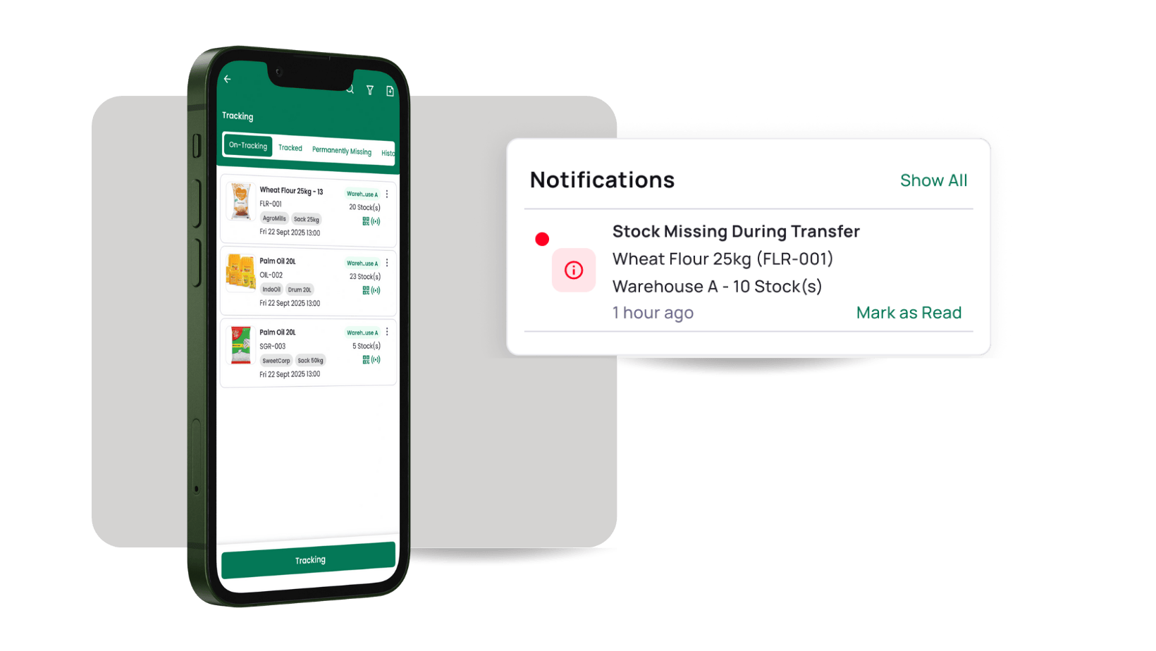 Le suivi est une fonctionnalité intelligente qui aide les organisations à identifier, localiser et récupérer les stocks signalés comme manquants ou non comptabilisés lors des opérations de stockage, des transferts ou des opérations quotidiennes. Grâce à des technologies comme la RFID, la NFC ou le QR Code, ainsi qu'à des scanners portables ou des lecteurs IoT, les utilisateurs peuvent rechercher les articles perdus en temps réel et mettre à jour leur état dès leur découverte.